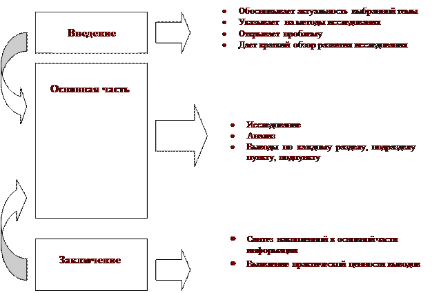 Этот же принцип построения рассуждений должен присутствовать в подразделах, пунктах, подпунктах. Даже в абзацах, мельчайших рубриках без заголовков и нумерации, следует придерживаться такой модели построения рассуждений. Это сделает вашу работу: