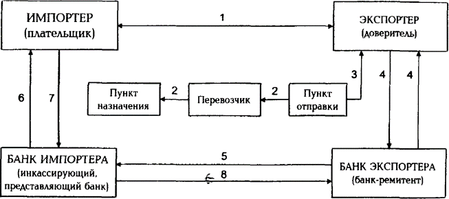 Схему расчетов по инкассо можно представить упрощенно в следующем виде: после заключения контракта, в котором оговаривается, через какие банки будут производиться расчеты, экспортер производит отгрузку товара. После получения от перевозчика транспортных документов экспортер передает все необходимые документы в банк, которому он поручает осуществлять инкассирование (банк-ремитент). Банк ремитент, проверив документы, направляет их банку-корреспонденту в стране импортера (инкассирующий банк). Последний, проверив документы, представляет их импортеру-плательщику. Инкассирующий банк может делать это непосредственно или через другой банк (так называемый представляющий банк). Документы выдаются плательщику: