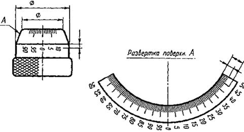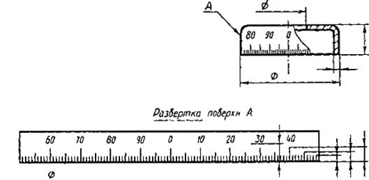 1.4.2. Если надписи и знаки должны быть нанесены на цилиндрическую или коническую поверхность, то на чертеже помещают изображение надписи в виде развертки.