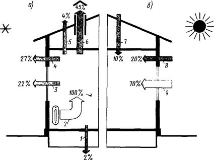 Рис. Примерная структура теплового баланса здания в холодный (а) и теплый (б) периоды года: