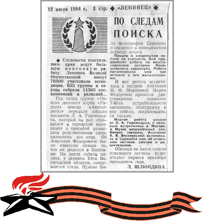 О двадцатилетнем отважном летчике-истребителе, комсомольце Анатолии Сорокине было известно только, что он родом из Кинешмы, окончил Кинешемский аэроклуб и среднюю школу №1.