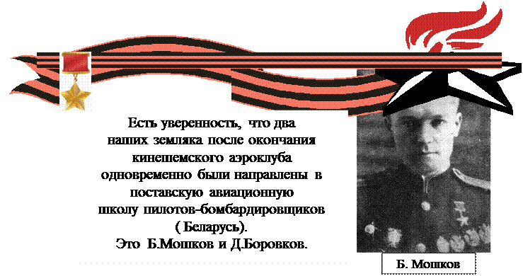 "Довольно дисциплинирован. Никаким взысканиям со стороны школы не подвергался". Это строки из характеристики, данной в ноябре 1940 года для поступления в кинешемский аэроклуб ученику юрьевецкой средней школы №1 Борису Мошкову. Именно из кинешемского аэроклуба начался путь в небо будущего летчика-штурмовика, Героя Советского Союза.