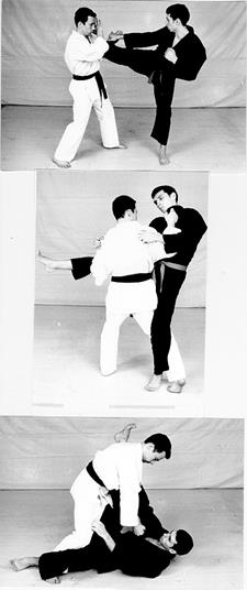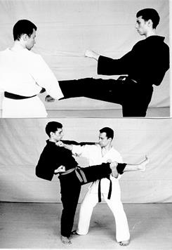 4. Защита ладонями от кругового удара ногой в голову. Удар слева отбивается правой ладонью, а справа – левой; рука, не ставящая блок, прикрывает голову (рис. 18, а).