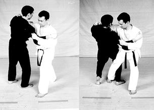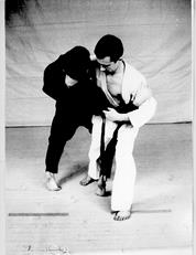 Левой рукой захватываем одежду противника под локтем правой руки, а правой захватываем одежду на плече. Затем с шагом левой ноги вперед (нога ставится на одну линию с плечом противника), одновременно двумя руками, переносим вес тела противника на его правую ногу и далее, резко ставя свою правую ногу за его ногами, выполняем бросок влево вниз (рис. 21).