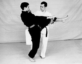 Выполняется при нанесении противником прямого удара сзади стоящей ногой. Делая блок левой рукой, отбив локтем вверх, правой захватываем голень бьющей ноги, одновременно уходя с шагом левой ноги влево-вперед. Правая рука продолжает движение, вместе с ногой противника, вперед-вправо, а левая захватывает одежду на груди противника. Подбросив правой рукой ногу противника вверх, левой тянем его вниз, одновременно левым бедром подбиваем левое бедро противника вверх и, придерживая его правую ногу, бросаем на пол (рис. 23).