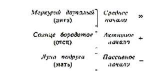 Во-первых, положительный, представленный самим рассказом: дитя происходит от отца и матери; потом - сравнительный, выраженный отношением лиц между собой; отношения света, тьмы и полутени, и наконец - смысл герметический, самый главный: закон творчества природы, - Солнце и Луна образуют Меркурий.