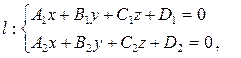 Прямая в пространстве может быть задана уравнениями двух плоскостей, пересекающихся по этой прямой (общие уравнения прямой):