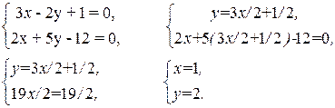 Пример. Покажем, что прямые 3х - 2у + 1= 0 и 2х + 5у -12 = 0 пересекаются, и найдем точку пересечения.