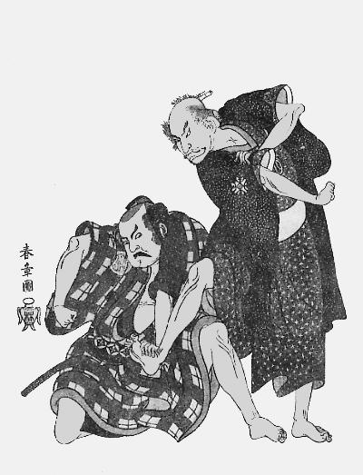 Бой голыми руками, который позже лег в основу дзю-дзюцу. Входил в ежедневную тренировку самураев еще с XV в, однако.. использование оружия считалось и более эффективным, и более благородным (гравюра XVIII в.)