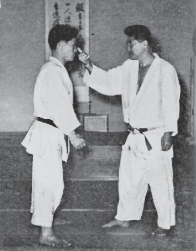 Инструктор показывает удар большим пальцем в глаз (из раннего дзюдо). Именно такая техника преподавалась в токийской полиции самим Кано Дзигаро