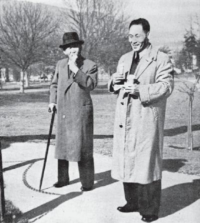 Дзигаро Кано ест мороженное в Ванкувере. Рядом с ним С. Сасаки, руководитель дзюдо в Канаде. Май, 1936 г.