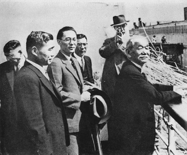 Кано на борту «Хикава мару» у причала в Ванкувере за несколько недель до своей смерти. Второй слева – И. Кумагаи, один из руководителей дзюдо в Сиэтле