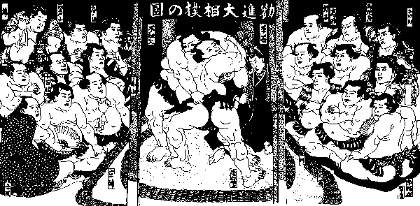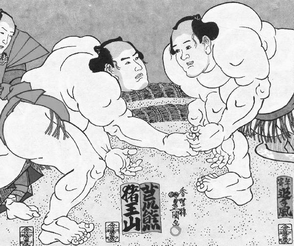 Состязания посулю (с древне-японской гравюры). Это – схватка не для зрителей, поскольку помост для борьбы окружают лишь сами сумоисты.