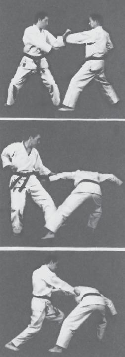 Комбинация из ката стиля Сито-рю: блок наружу (ути-укэ) с захватом, надергиванием на себя и атакой прямым ударом гьяку-цки