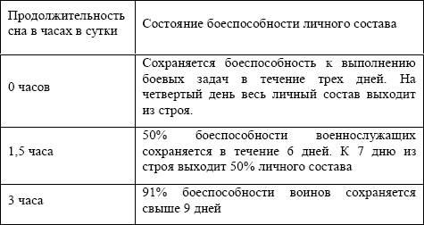 Американский военный специалист Б. Повер, подчеркивая, что умеренный сон помогает лучше преодолевать боевой стресс, указывает на его минимальную ежесуточную продолжительность: 4 часа для солдат и 6 часов для командиров. Отмечается, что у командира, принимающего решения, недостаток во сне скорее провоцирует развитие боевой усталости. Таким образом, контроль за качеством сна воинов является важным средством сохранения боеспособности личного состава и, следовательно, задачей медико-психологического обеспечения боевых действий.