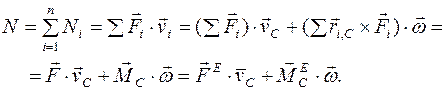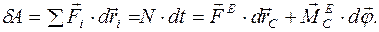 Поскольку главный вектор и главный момент внутренних сил равны нулю, то эти силы не совершают работы при движении твердого тела. Работа складывается из работы главного вектора внешних сил при поступательном движении тела (вместе с полюсом С) и работы главного момента внешних сил при сферическом движении вокруг полюса.