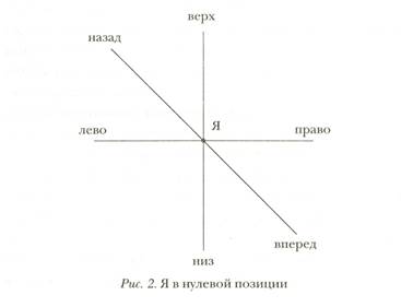 Чистая самотождественность описывается очень коротко: я это я, я есть. Все. Мы знаем много примеров, когда у человека по тем или иным причинам была стерта память и он помнил одно: что это он ничего не помнит. Вот это чувство Я, глубинное чувство Я, оно и является центром, образно говоря, нашей вселенной. Для того чтобы перейти к технологии, предлагается следующее внутреннее структурирование. Прежде всего нам нужно получить целое, которое дало бы нам возможность осознавать свою субъективность с этой точки зрения. Предлагаю для этого использовать естественную систему координат. Эта структура существует у всех людей без исключения, и она очень проста: верх - низ, право - лево, впереди - позади. На языке метода качественных структур это так называемая гиперструктура. Наша самотождественность, наше Я, про которое мы ничего не можем сказать, кроме того что я - это я, я есть, прикрепляется в центре этой системы координат, в нулевой точке. В этом смысл выражения: «Я никто и зовут меня никак». То есть Я прикрепляется к неявленному.