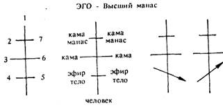 Круг символ движения (с востока на запад). Верхний полюс вертикального магнита — это Эго в девачане нижний полюс — это человек, живущий на Земле. Восточный полюс горизонтального диаметра — это кама-манасическое, камическое и эфирное тело, ИДУЩИЕ последовательно к воплощению. Западный полюс — это эфирное, камическое, кама-манасическое тело, идущие к Эго с зарядами опыта. Девачан — это план высшего манаса. Собственно говоря, "Эго" есть высший манас — истинный манас, содержащий в своем центре Монаду — Атма-Буддхи, частицу Высшего Духа, из которого эта искра была выделена. Но этот Высший Дух не является "Богом", ибо Он, в свою очередь есть частица еще более Высокого Духа, стоящего над ним. Лишь только эта лестница духов или Иерархов, уходящая в беспредельную высь может быть названа коллективным Богом. Такое многообразие не противоречит принципу Единобожия, ибо Пирамида Создателей представляет собою монолит, который сходится на самой высшей ступени в единую ТОЧКУ.