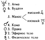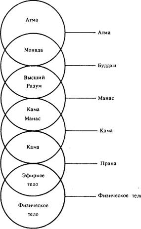 Е.П.Блаватская считает, что физическое тело не является принципом, но лишь футляром принципов, также Прана — жизненная сила, равно пребывающая во всех формах Природы, не есть личная энергия человека, но это есть просто жизненная СИЛА ПРИРОДЫ, действующая через эфирное тело, которое индивидуально для каждой личности. Седьмой Принцип — Атма, который в других схемах считается первым, не есть нечто, присущее человеку, но лишь отражение Мирового Солнца, кончик одного из его бесчисленных лучей. Практически лишь Буддхи, Манас, Кама и Эфирный двойник индивидуальны и принадлежат человеку. Вместе с тем нам приходится сталкиваться (особенно в астрологии) с несомненным наличием двух Манасов — с Манасом Высшим, бессмертным и Манасом низшим, умирающим вместе с личностью. Однако Буддхи не существует без Мировой Энергии, а эфирное тело есть отражение физического тела и связь его с Камой. Поэтому в схеме человеческих принципов трудно избежать, как Атмы, так и физического тела.