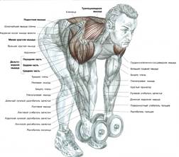 И.П.: стоя в наклоне угол 90о между туловищем и бедром, руки с гантелями внизу.