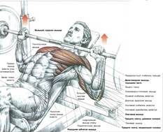 Воздействие на основные м.г.: верхняя часть грудных мышц, передняя часть дельтовидных мышц, трехглавая м. плеча.