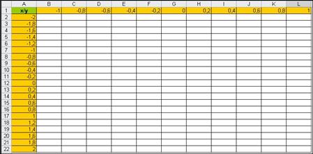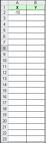 · в первой строке столбца Х (ячейка А2) поставить начальное значение Х: -10. во второй строке столбца Х (ячейка А3) набрать формулу: =А2+0,2 (следующее значение Х)