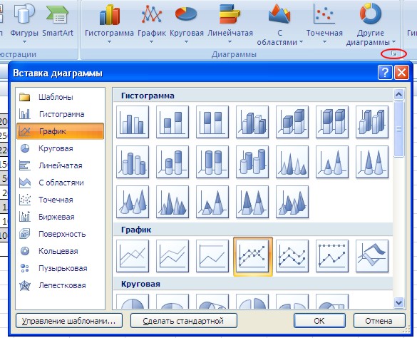 Если не устраивает ни один из предложенных вариантов диаграмм, то необходимо воспользоваться кнопкой вызова окна панели "Диаграммы".