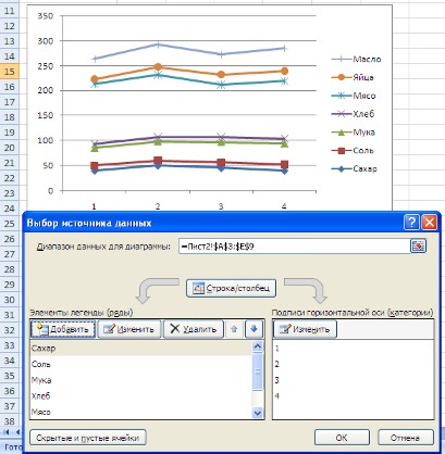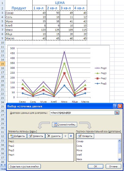Для взаимной замены данных на осях надо воспользоваться кнопкой "Строка/Столбец".
