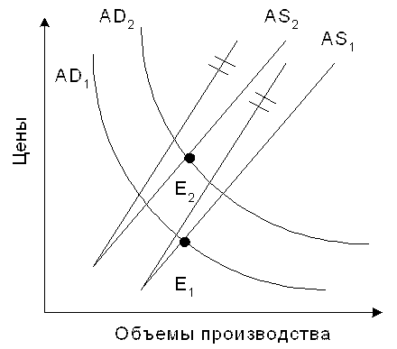 Понижение курса валюты, повышая экспорт. Возможности страны, увеличивает совокупный спрос, что характеризуется на графике сдвигом AD1 в AD2.