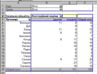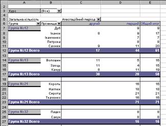 ЗАУВАЖЕННЯ: для такого групування не обов’язково використовувати описаний вище метод. Достатньо розмістити поле ГРУПА в полі рядків перед полем ПРІЗВИЩЕ.