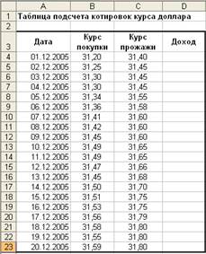 Доход = Курс продажи - Курс покупки, в ячейке В4 наберите формулу = С4-В4 (в адресах ячеек используются буквы латинского алфавита).