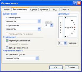 4. Для оформления шапки таблицы выделите третью строку (нажатием на номер строки), задайте перенос по словам командой Формат/Ячейки/вкладка Выравнивание/Переносить по словам, выберите горизонтальное и вертикальное выравнивание —«по центру» (рис. 2).