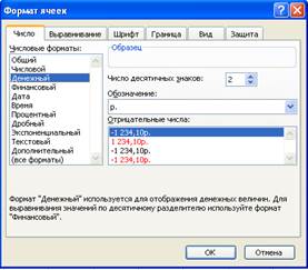 9. Для ячеек с результатом расчетов задайте формат Финансовый (Формат/Ячейки/вкладка Число/формат Финансовый, обозначение признака валюты — «р.» — рубли, число десятичных знаков задайте равное 2).