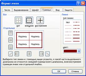 10. Произведите обрамление таблицы (рис. 4). Для этого выделите блок ячеек таблицы, начиная от верхнего левого или от нижнего правого угла таблицы. Откройте окно Обрамление таблиц командой Формат/Ячейки/вкладка Границы. Задайте бордовый цвет линий. Для внутренних линий выберите тонкую, а для контура — более толстую непрерывную линию. Макет отображает конечный вид форматирования обрамления, поэтому кнопку ОК нажмите, когда вид обрамления на макете полностью вас удовлетворит.