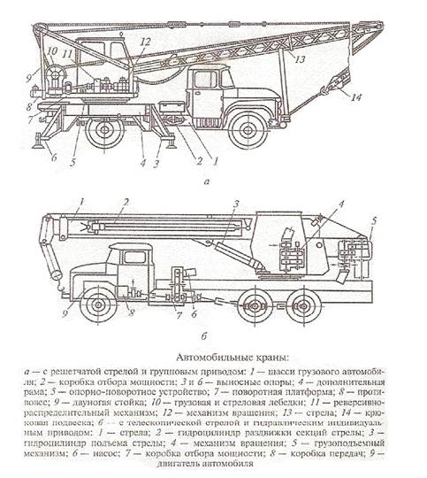 В последнее время краны на автомобильном шасси с телескопическими стрелами стали снабжать дополнительным оборудованием - монтажными люльками, что существенно расширяет область их применения. Механизмы крана приводятся в движение от дизеля базового автомобиля через коробку отбора мощности 2 (в случае группового привода) или индивидуально (при индивидуальном приводе) с использованием электрической или гидравлической трансмиссии. Кинематическая схема крана с механической трансмиссией позволяет совмещать подъем груза с поворотом платформы.
