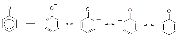 Фенолы примерно на пять порядков по кислотности сильнее спиртов. Для фенола значение р К а = 9.98. Это связано с возможностью стабилизации образующегося фенолят-аниона:
