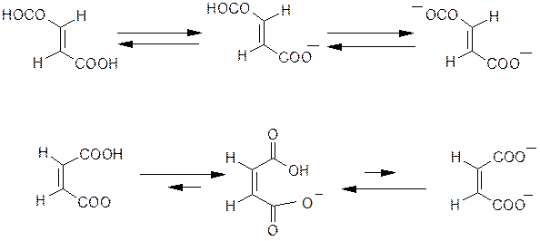 Из приведенной схемы следует, что р К а 1 =3.02 (фумаровая к-та) > р К а 1 =1.92 (малеиновая к-та), ар К а 2 = 4.38 (фумаровая к-та) < р К а 2 = 6.23 (малеиновая к-та). Это связано с тем, что моноанион малеиновой кислоты стабилизируется за счет внутримолекулярной водородной связи.