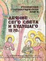 Некоторые неожиданные находки сибирских музейных работников могут дополнить представленную выше характеристику сведениями о духовном мире сибирских старожилов4. Так, в 1990 году коллекция Новокузнецкого музея изобразительного искусства пополнилась рукописной книгой Деяния сего света и будущего, написанной в 1878 году. Книга эта таит в себе немало загадок, первая из которых - имя писца, скрытое под цифрами шифра. Неизвестно пока и место создания книги, по счастливой случайности найденной коллекционером Г.А.Исаевым в букинистическом отделе магазина среди современных изданий.