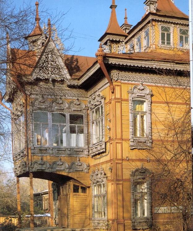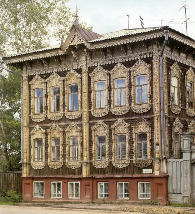 Соединение народных традиций и каменного городского зодчества в региональной культуре XIХ в. хорошо иллюстрирует томский материал. Не случайно в работах искусствоведов часто встречается метафора Деревянное кружево Томска применительно к определяющей черте городской архитектуры конца XIX начала ХХ вв. С конца XVIII и до середины XIX века город Томск застраивается преимущественно по образцовым проектам, своеобразно применяя их в зависимости от местных условий. Ампирные деревянные особняки еще сохранились в городе, хотя ныне с каждым годом их становится все меньше и меньше. Они представляют несомненный интерес, являясь образцами высокой культуры строительства, в которых народная строительная практика, обогащенная арсеналом средств профессиональной архитектуры, нашла достойное воплощение. Стремление к созданию нового стиля заставляло архитекторов искать его прототип в формах русской средневековой, допетровской архитектуры. Наиболее зримо эти поиски отразились в декоративном убранстве сооружений, в частности, в использовании национальной орнаментации в обработке фасадов. Здесь же необходимо заметить, что такое обращение к наследию было более органичным и убедительным в деревянных постройках, нежели в каменных. Именно в этот период закладываются начала томской домовой декоративной резьбы, той, которая принесла заслуженную славу древнему сибирскому городу6.