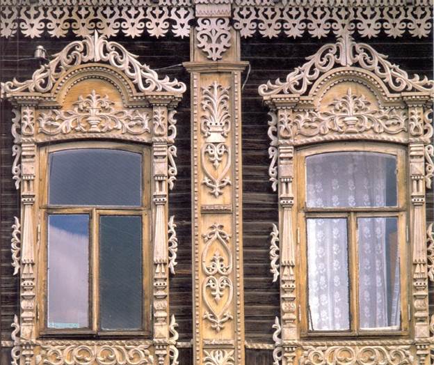 Вполне закономерно, что в Сибири, заселенной в значительной степени выходцами из северных областей Европейской России, а также посещаемой бригадами тамошних плотников, древние мотивы получили в крестьянском зодчестве дальнейшее развитие. Причем языческие истоки художественных образов просматриваются не только в барочных формах, но и из-под наслоений классицизма, а иногда и модерна. Достаточно взглянуть на зарисовки оконных наличников старых изб в деревнях Томской и Новосибирской областей и более поздних - на Алтае. В композициях центральное место занимает, как правило, лучистая полурозетка, а слева и справа от нее располагаются головы птиц или фигурки коней, то довольно реалистические, то сильно стилизованные.