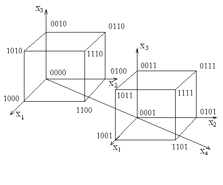 ФАЛ можно представить в виде n-мерного единичного куба: если наборам значений аргументов сопоставить точки n-мерного пространства, то множество 2n наборов определяет множество вершин n-мерного куба.