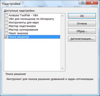 Запуск надстройки «Поиск решения» осуществляется командой «Поиск решения» на ленте «Данные – Анализ» в версии Ехсеl 2007 или командой меню «Сервис – Поиск решения» в предыдущих версиях. Если команда недоступна, то следует выполнить активизацию надстройки «Поиск решения», установив соответствующий флажок в списке доступных надстроек (рис. 6). Окно подключения надстроек вызывается в версии Ехсеl 2007 последовательностью команд «Кнопка Office – Параметры Ехсеl – Надстройки (Управление: Надстройки Ехсеl) – Перейти» или командой меню «Сервис – Надстройки» в предыдущих версиях.