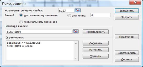 Теперь можно изменять значения ячеек C9:D9 и анализировать изменение требуемых ресурсов (G3:G6) и ожидаемой прибыли (G7). При запуске надстройки «Поиск решения» появляется диалоговое окно, в котором следует задать адрес целевой ячейки (G7), изменяемых ячеек (C9:D9), добавить ограничения (рис. 8).