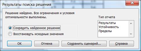 О результатах поиска решения можно узнать в появляющемся после выполнения расчётов окне (рис. 10).