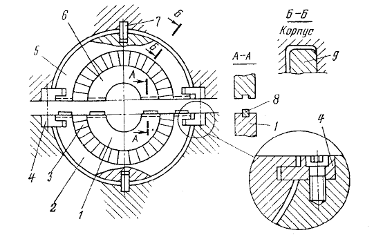 1, 6 –тело диафрагмы; 2, 5 –обод; 3 –сопловые лопатки; 4 –лапки подвески диафрагмы вкорпусе; 7- продольная шпонка; 8 –шпонка; 9 –положение диафрагмы врасточке корпуса.