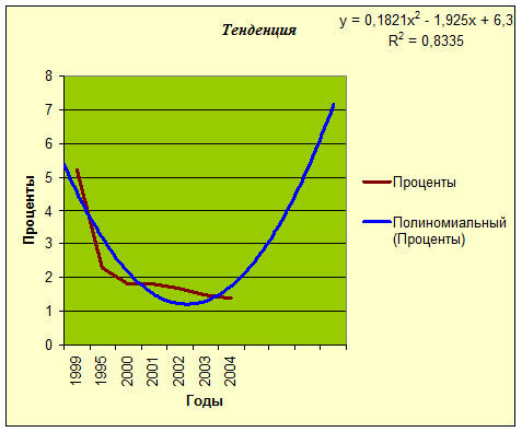 ТЕНДЕНЦИЯ(B3:B9;A3:A9;A14) – первый интервал проценты, второй-года, третий – новый год.
