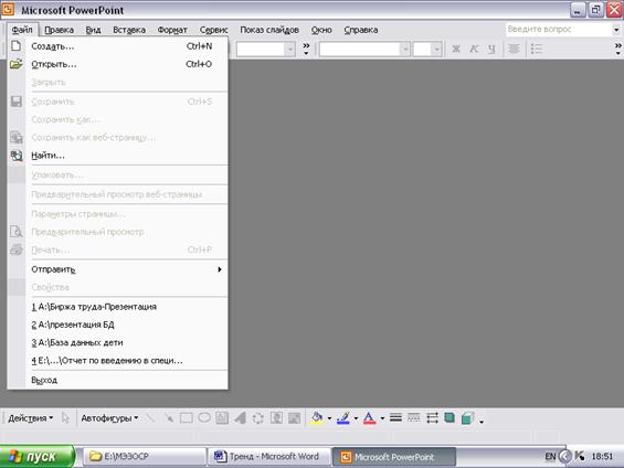 После загрузки Windows, используя Главное меню и окно программы, по которому пользователь выбирает способ построения презентации либо открывает ранее созданную презентацию.