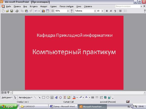 Создаваемая презентация будет использовать цветовую гамму, заголовок и стили текста презентации, установленные в Power Point, либо к ней применяется Оформление по умолчанию одного из предлагаемых в окне диалога Применить шаблон оформления (например, Ленты, Метеор, Синий обелиск, Электронная паутина, Тетрадь и др.).