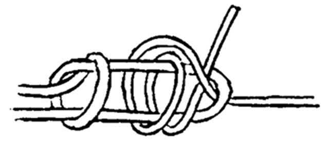 Берем две веревки разного диаметра, из более толстой веревки делаем петлю, а ходовым концом тонкой обкручиваем ее так, как показано на рисунке. Затем узел затягивается, расправляется, и на обоих концах вяжутся контрольные узлы.