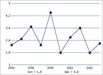 Как мы видим на приведенном выше графике с 2004 по 2006 г. инфляция росла но уже в 2007 году показатели снизились до значения 2,3 и уже в 2008 году уровень инфляции достиг своего максимума - 4,4 и за максимальным значением инфляции последовал резкий скачок который снизил инфляцию до минимального значения в 2009 году — 1,8 на протяжении 2010 и 2011 годов инфляция имела тенденцию к росту и в 2011 она приняла значение 3,4, а в 2012 году инфляция снова достигла своего минимума но потом вновь начала расти. В 2013 году инфляция приняла значение равное значению в 2004 году — 2,3.